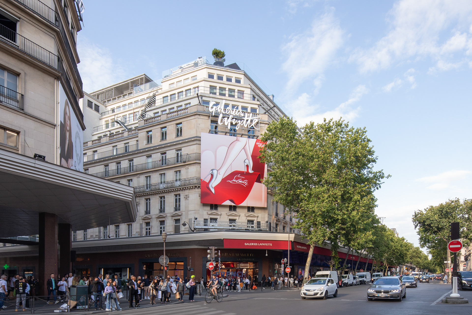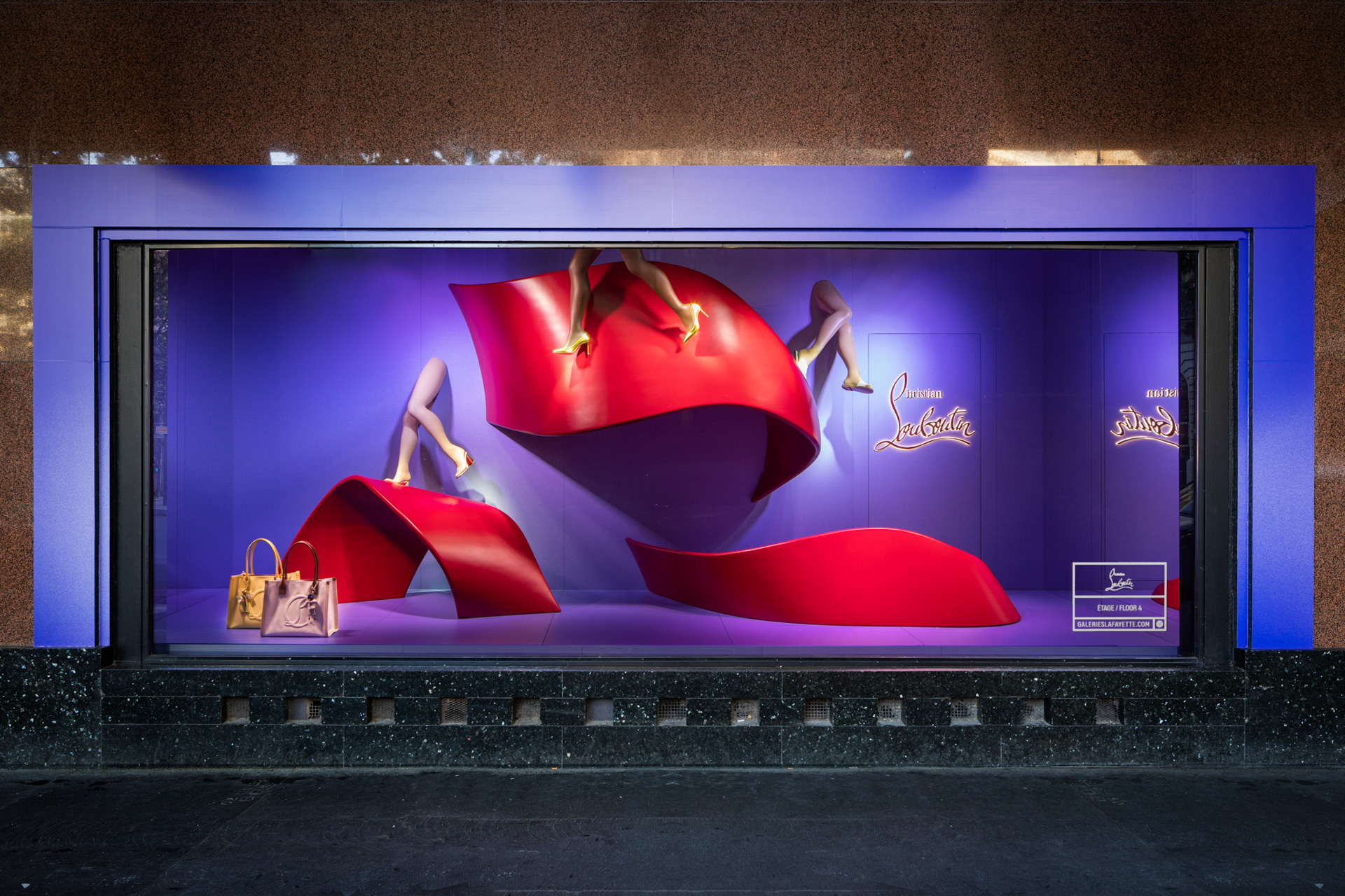 De la Coupole, à la vitrine boulevard Haussmann. Une scénographie originale qui fait écho à l’élégance à la française, portée par la semelle rouge, signature iconique de la Maison.