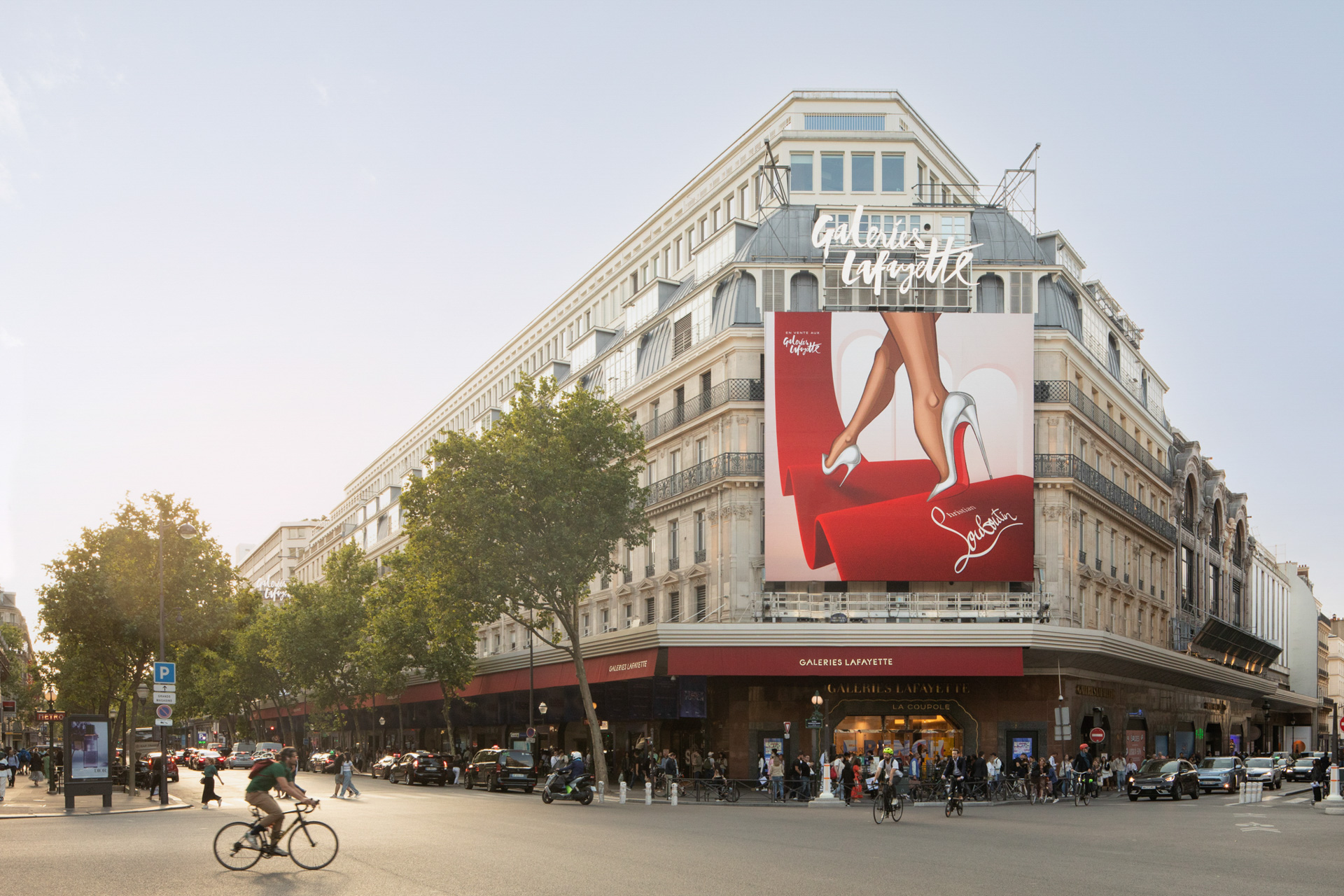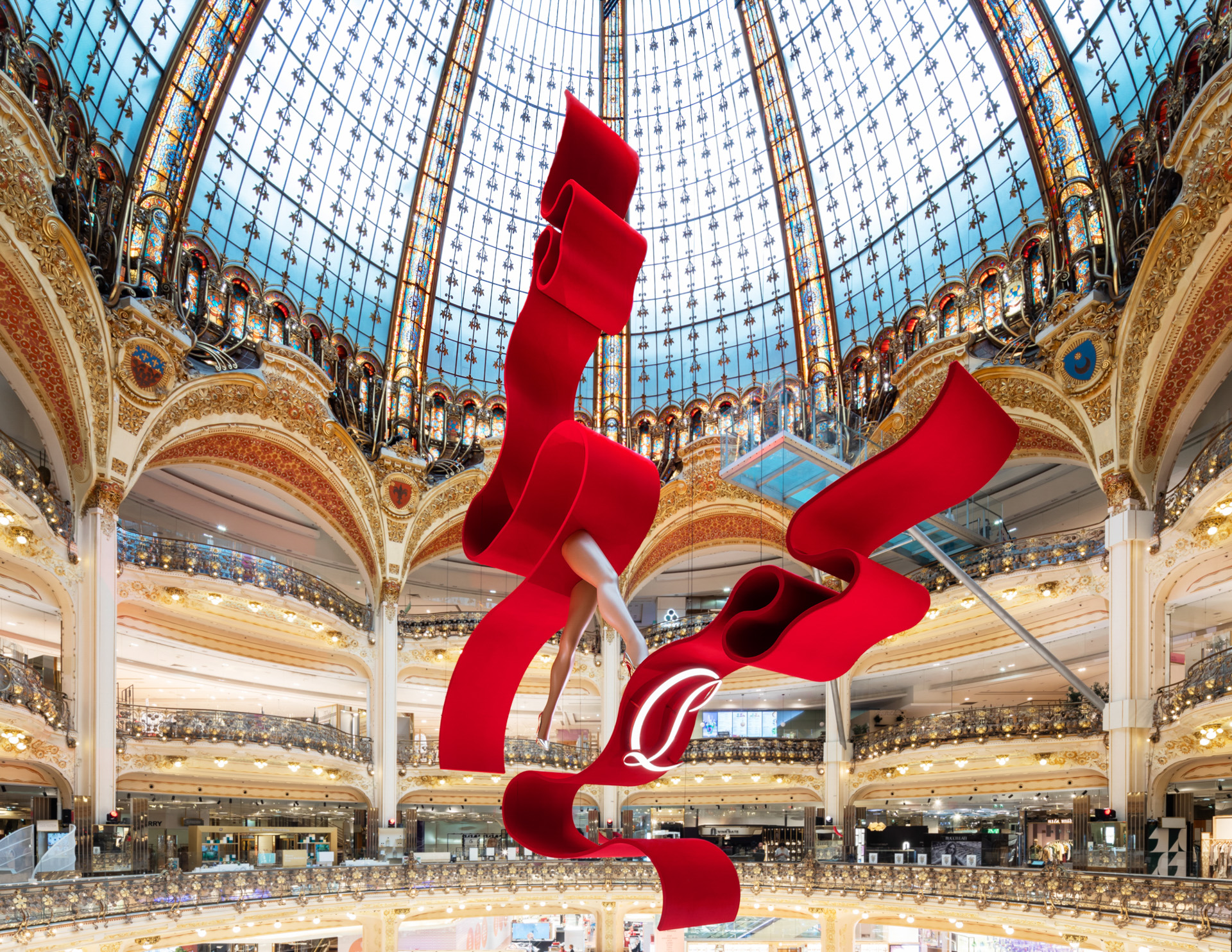 La maison Christian Louboutin investit les quatre coins des Galeries Lafayette Paris Haussmann d’installations aux proportions inédites.