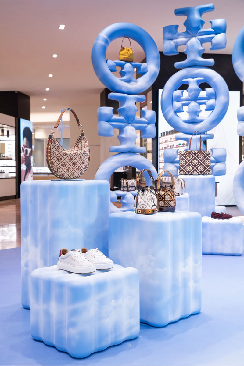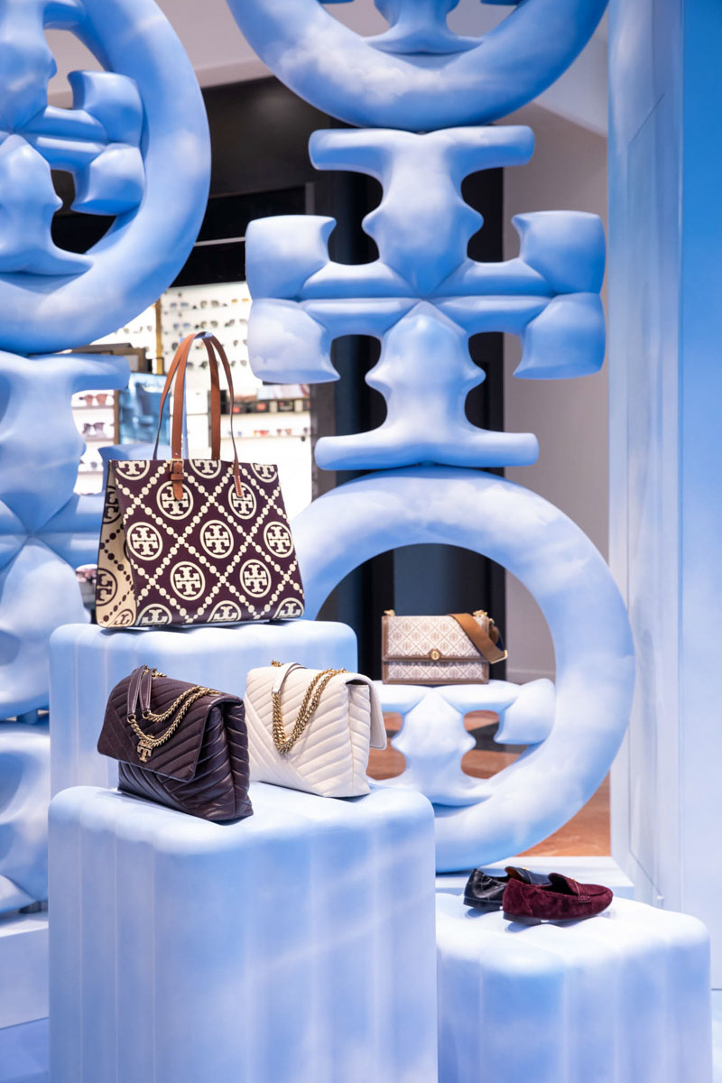 L’installation présente la nouvelle collection T Monogram, et comprend des sacs à main, des chaussures, et d’autres accessoires.